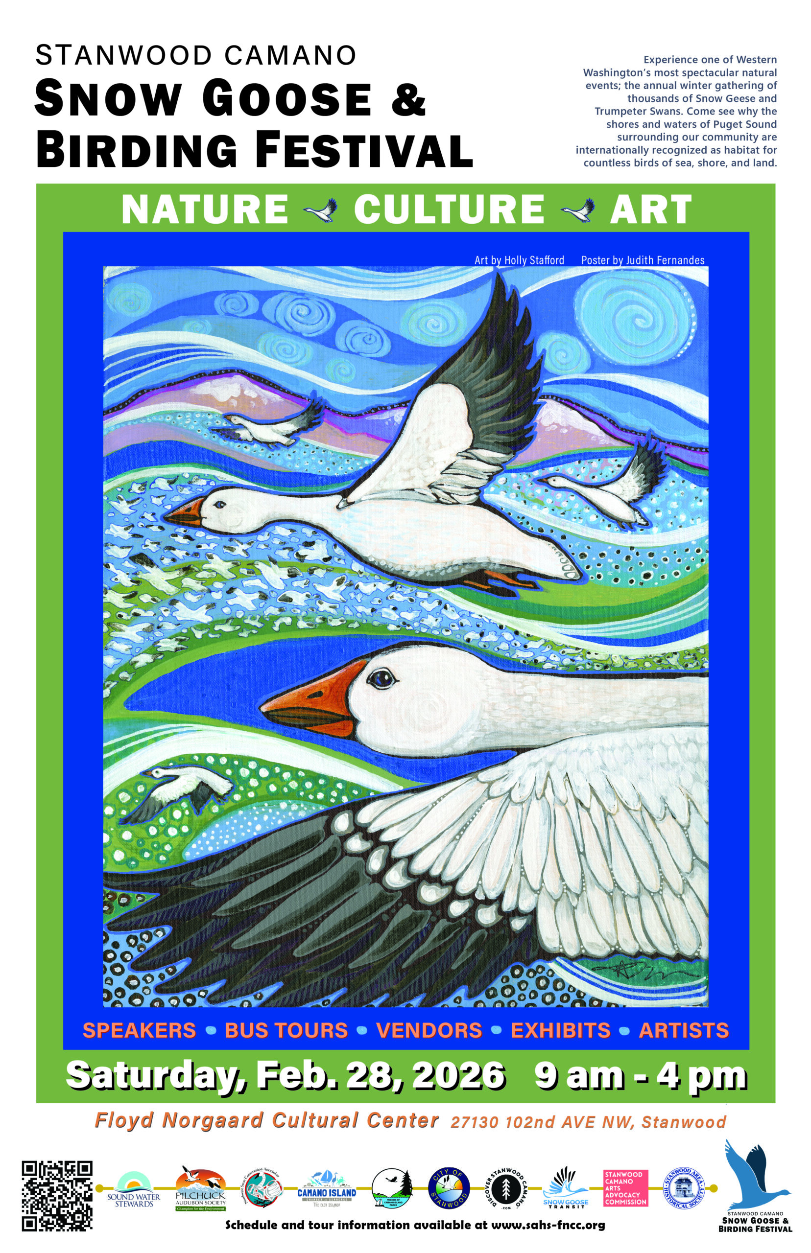 Camano Island Chamber of Commerce, City of Stanwood, Discover Stanwood Camano, Northwest Swan Conservation Assn., Pilchuck Audubon Society, Snow Goose Transit, Sound Water Stewards, Friends of Camano Island Parks (FOCIP), Stanwood Camano Arts Advisory Commission (SCAAC) and the Stanwood Area Historical Society